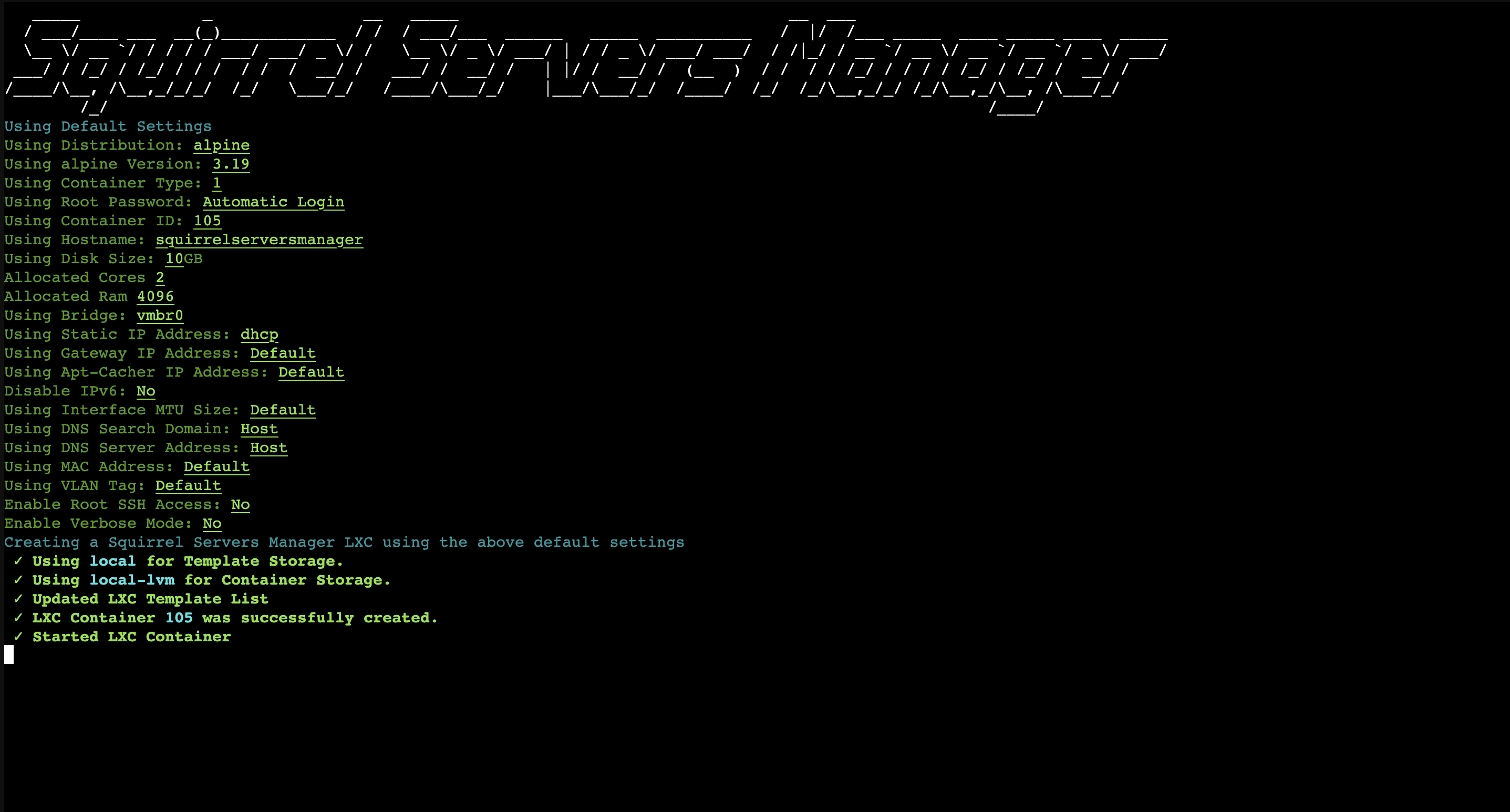 Wait several minutes until the script finishes the installation of SSM on a new LXC container. The process can be quite long.